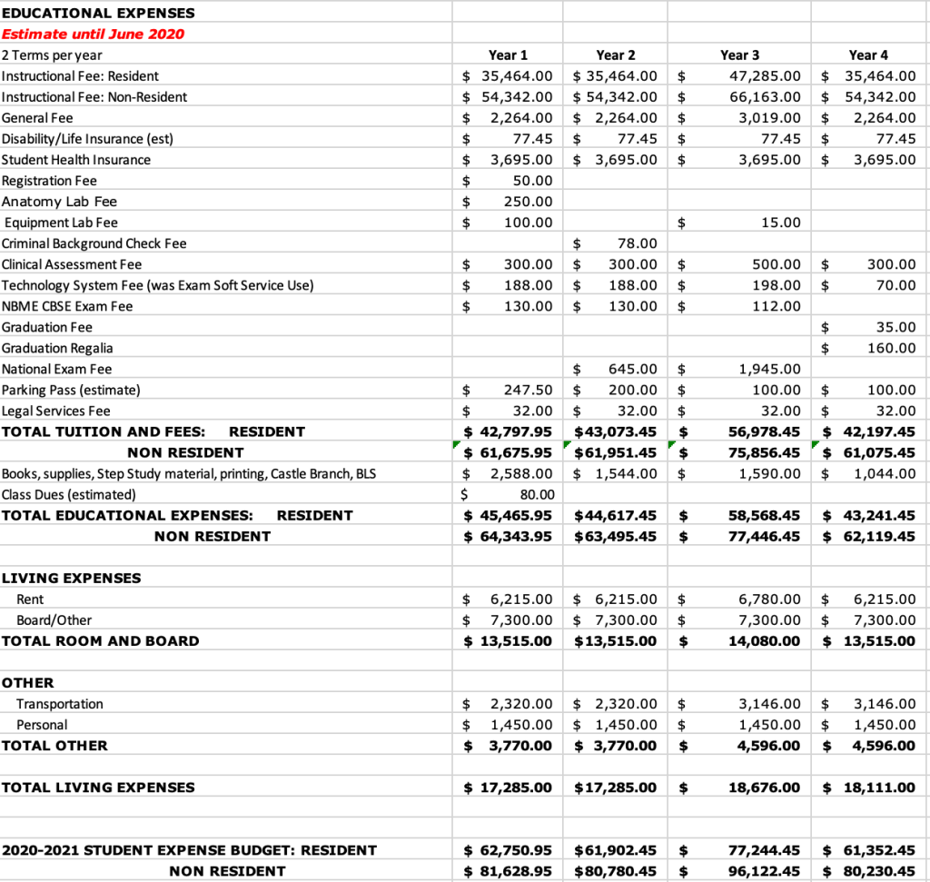 So, if you are a native resident and living with your parents, the total cost of medical school would be about $191, 893. If you were getting an apartment to live near campus the total cost would be $263,250.30. And…if you are a non-resident (assuming that you have no family here and would get an apartment), your total costs could be $338,762.30!!!!!!!!!