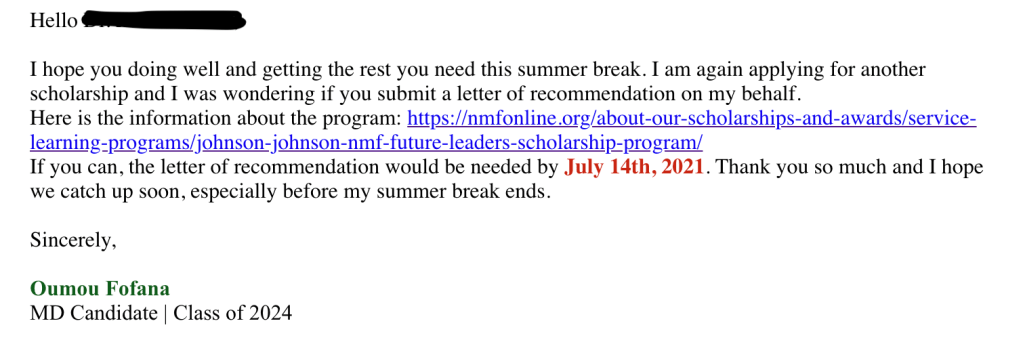 Now that I had my list, I actually had to apply for the scholarships. This was the hardest part. I hate writing essays with a passion because I judge myself a lot when I write so there were some I did not even apply for! This is not good because you miss all the chances you do not take. I would list out the scholarships that would be due in chronological order and give myself at least a month for big scholarships and at least 2 weeks for smaller scholarships. Definitely find out if the application requires letters of recommendation. I would usually send out an email to my letter writers about 2 weeks-1 month in advance and tell them something along the lines of: