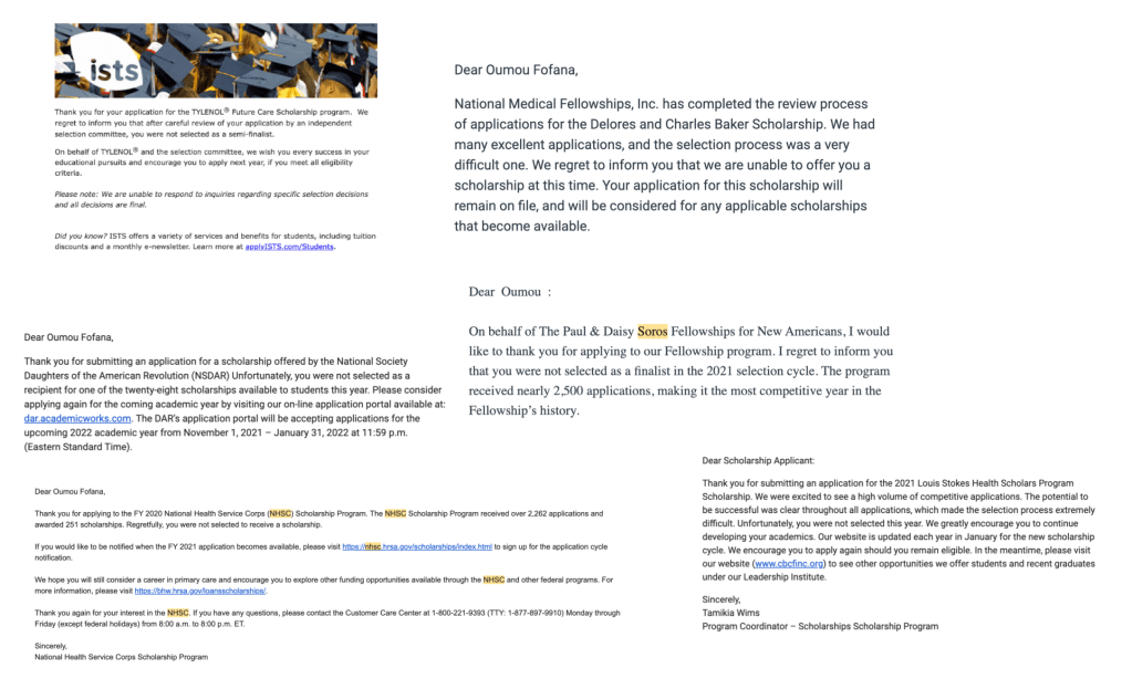 Rejection is going to be your best friend on this journey to getting scholarship awards. Out of all of the major scholarships I applied for, I am extremely fortunate enough to have received two: the NHSC Scholarship and the NMF/Johnson and Johnson Program. I got accepted for NHSC after applying twice and I was pretty much at my last string when I was applying to the J&J scholarship. Before I got those, I would just cry when I received the rejection emails. I just wanted to achieve my goal and I did not know if it would be possible.